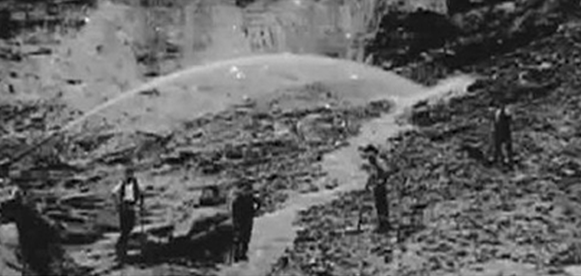 channelled into rows of wooden sluice boxes and the gold ore collected.