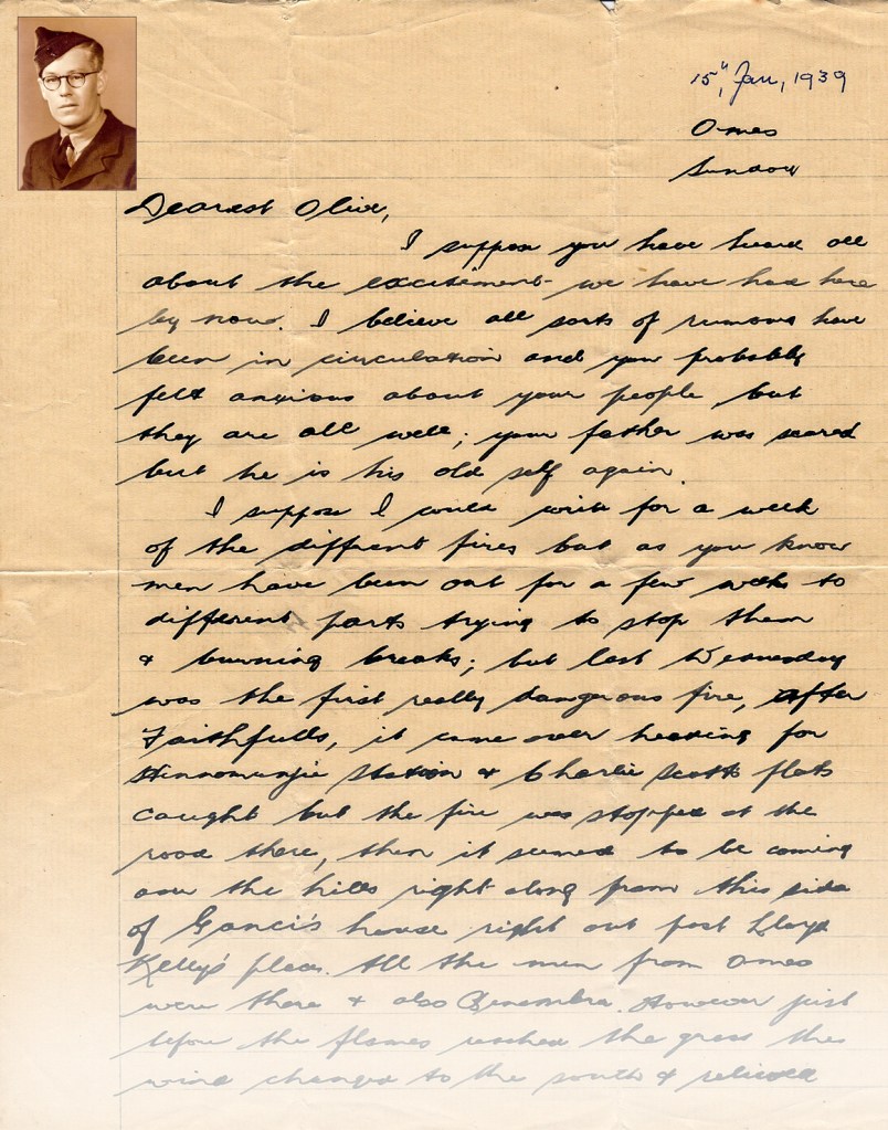 I suppose I could write for a week of the different fires, but as you know, men have been out for a few weeks to different parts trying to stop them and burning breaks; but last Wednesday was the first really dangerous fire.